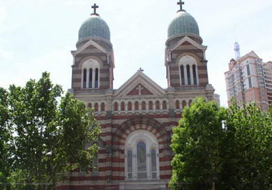 西开教堂又称法国教堂。在天津和平区滨江道独山路原墙子河外老西开一带,故名。包括天主教总堂和大教堂,分别建于1914年和1917年,为法国天主教所建。大教堂采用法国罗曼式建筑造型,高45米,建筑面积1585平方米,平面呈长十字形,正面和后部耸立高大塔楼三座,呈“品”字型,楼座以黄、红花砖砌成,上砌翠绿色圆肚形尖顶,檐下为半圆形拱窗。堂内为三通廊式,内墙彩绘壁画,装饰华丽。西开教堂是天津教堂中规模最大的一座。现已修饰一新,对外开放。 |