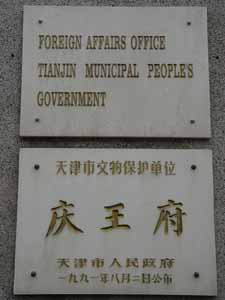 庆王府位于和平区重庆道55号,现为市政府外事办公室使用。占地面积4385平方米,建筑面积5085平方米。该建筑为带地下室三层砖木结构小楼。其立面二层外用类似爱奥尼克柱围成柱廊,栏杆用黄、绿、紫三色相间的六棱琉璃柱围成。平面为长方形,中央为方形大厅,设一座可拆卸的小戏台。一、二层大厅周围有列柱式回廊,四周为居室,各厅之间木雕隔段,顶棚有精美雕饰。第三层的八间房是供奉祖先的影堂。院内有大花园,设假山、石桥、亭子,景致宜人幽雅。 庆亲王载振是清代第十二个、也是最后一个“铁帽子王”。光绪十年(1884年),他的父亲奕劻任总理各国事衙门封庆郡王,次年,与醇亲王一起办理海军事务;光绪二十年(1894年)封庆亲王。 庆王府原为太监张祥斋(即小德张)寓所。1925年清室庆亲王奕劻之子载振购得此寓,并在这里度过晚年,故世称“庆王府”。