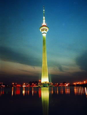 天津广播电视塔,位于天津市河西区聂公桥南、紫金山路与津溜公路汇合处,取其首尾二字,所以简称“天塔”。塔身高415.2居当今亚洲之冠,跻世界高塔之林。它于1991年建成,耸立于碧波与云霄之间,是世界上唯一一座“水中之塔”,其势如剑倚天,享有“天塔旋云”之美称。 天塔集旅游观光、餐饮、娱乐、广播电视等多项功能于一体,它可同时播出7套彩色电视节目和9套调频立体声广播节目。对游人开放的有塔座大厅、嘹望厅、太空旋转厅和270米露天观光平台,在嘹望厅内可借助各角落的望远镜将方圆百里的景色尽收眼底。第三层是旋转餐厅,同时可容纳200多人,每隔45分钟,餐厅便自转一周,人可随厅转,目便随景移,其感受妙不可言。