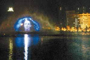 天塔湖水幕电影 天塔旁的天塔湖内设有世界一流领先科技的大型音乐灯光喷泉组泉、水幕电影,沿湖南岸有国内最长的人工塑山,成为天塔湖游览区的一个亮点。白天,鲜花草木与湖光塔影相应成趣;入夜,波光夜空间,荧塔与星月争辉,难分天上人间。 天塔旁的天塔湖内设有世界一流领先科技的大型音乐灯光喷泉组泉、水幕电影,沿湖南岸有国内最长的人工塑山,成为天塔湖游览区的一个亮点。白天,鲜花草木与湖光塔影相应成趣;入夜,波光夜空间,荧塔与星月争辉,难分天上人间。 |
