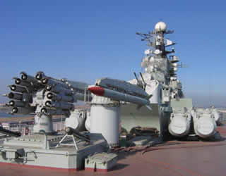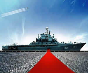 基辅号航空母舰位于天津市汉沽区营城八卦滩,是前苏联“基辅”级航母的首制舰。1970年7月建造,1972年下水,1975年服役,1994年退役,共服役19年,最初被定位为反潜巡洋舰。它在历史上虽未参加过任何战役,但服役间曾出访印度、朝鲜及阿尔及利亚等国家,被前苏联造船工业视为“国家名片”。 通过登舰梯,走进五甲登舰大厅。航空母舰的空间排列是甲板向下依次排列,甲板称一甲,向下一层为二甲;舰岛第一层为一甲,向上一层为01甲,类推。基辅号航母全场273.1米,型深21.6米,排水量40500吨,自重2.3万吨,全舰17层。搭载12架战斗机,21架直升机,载士兵1200名。飞行甲板在基辅航母左半部,长200米,宽30米,整个甲板有3个足球场大小。甲板后方有长方形升降口,下方是一个约3000平方米的机库,甲板上有6个飞机起降位置。航母右半部是一艘导弹巡洋舰的模型,装备着对空对海攻击的各式武器,交错布置了4座仿真SSN-12型远程舰对舰导弹,弹仓有10米长,16枚仿真导弹编成2组。航母的前甲板上,有2座双联装对空导弹发射架,2架反潜深水炸弹发射架,一座双联装76毫米口径火炮,一座井式对空弹导发射架。航母的舰桥与桅杆有十几层楼高,它的前部几层舱室是航母的指挥中心,编队司令、舰长在此发号施令。舰内有鱼雷发射舱、鱼雷、深水炸弹显示控制台、反舰、反潜导弹控制台、飞机起落指挥控制台、三甲对空导弹舱、反潜导弹舱、二甲对空导弹舱等现代军备。