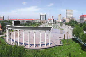 世纪广场建于1999年5月30日。南北长461米,东西宽213米,占地98193平方米,绿化面积51060平方米,硬铺装47133平方米,广场灯130盏。广场东部配置部分南方花木,北部波浪式流线型嵌草铺装,中部建3513平方米旱式音乐喷泉,南部设柱廊表演台,花岗岩罗马柱12根,高12.1米,直径1.36米,表演台花岗岩铺装面积1400平方米。西部为大面积草坪绿地,红屋顶欧式建筑点缀其间。 |