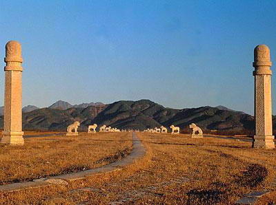 景陵 景陵是康熙皇帝爱新觉罗·玄烨的陵寝,位于清孝陵东侧1公里处。该陵于康熙十五年(1676年)二月十日动工,康熙二十年(1681年)完工。 景陵北依昌瑞山,建筑布局由南往北依次为:圣德神功碑亭、五孔拱桥、望柱、石像生、下马碑、神厨库、牌楼门、神道碑亭、二柱门、台石五供、方城、明楼、宝城、宝顶,宝顶下是地宫。这些大大小小的建筑以一条宽9.70米的神路贯穿成一个完整的序列,该神路南与孝陵神路衔接,北端直达宝城,弯环如龙,盘曲有情。 景陵是清五朝在东陵界内营建的第二座皇帝陵,其建筑规模稍逊于孝陵,建筑规模总体上是以孝陵为蓝本,但局部又有所改创。如圣德神功碑亭内立双碑;石像生缩减为5对;改龙凤门为牌楼门等。景陵在葬制上也有重大变革,开创了先葬皇后,附葬皇贵妃的制度;另外还摒弃了尸体火化入葬的传统而改为土葬。景陵的建筑风格及丧葬形式大多为后世所效仿,起到了承上启下的作用。 清朝皇陵中的圣神功德碑亭是由嗣皇帝兴建的,用以彰扬先皇一生的功业,景陵圣德神功碑亭建于雍正三年至雍正五年(1725-1727年)。按照雍正皇帝的意愿,亭内竖立了两块石碑,分别镌刻满文、汉字,用以记述康熙大帝60多年的赫赫功德。碑文由雍正皇帝亲自撰写,长达4300多字,是后世研究康熙朝历史的珍贵史料。 景陵石像生的布置有别于清代所有帝陵,自五孔桥至牌楼门段的神路由于地形的影响而呈弯环的曲线,无法像其它陵寝那样对称布置,于是当时的建筑设计人员就根据神路走向因地制宜随曲就弯地进行设置,一改其呆板的模式而呈现出灵活多变、步移景换的效果,体现了当时人们的聪明和才智。