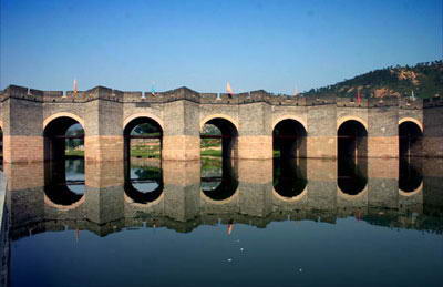 九门口水上长城简介 九门口水上长城始建于北齐(公元479-502年),扩建于明初1381年。明代以前,这里是重要的军事关口。九门口水上长城全长1704米,是中国万里长城中唯一的一段水上长城,其跨河墙长达100多米。九江河水从九门口水上长城下的九道水门直流而过,“城在山上走,水在城下流”,景色壮观。 门口属燕山余脉,群峰簇聚,层峦叠嶂,山势较高,坡陡崖峭,青龙河从两山之间流过,旱季河道干涸,雨季山洪暴涨,众山之水,汇为一流,水势湍急,有如“万壑赴荆门”,石砂转流,势不可挡。明代洪武年间,徐达督军到山海关一带修筑长城,在这里为了做到既有高墙抵敌,又可放洪水通过,便在长城河谷处扩建了这九门口。光绪十八年(公元1892年)路基与六座水门洞被洪水冲毁,光绪三十年(公元1904年)重修。当年修城者为了保护长城不被洪水冲毁,在桥墩四周及上下游地面上,铺砌了连片的巨型花岗岩条石,铺石面积7000平方米,用条石1.2万多块。水门下用一片片条石铺出的河床,远远望去好像一片巨大的板石,故九门口又称“一片石”。