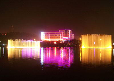 龙湖公园位于邯郸市主城区东部,占地面积约41.7公顷,是以植物造景为主,以“水林景色”为特色的开放式生态休憩公园。其绿化面积达到26.36公顷,栽植乔灌木166种,草坪18万平米,水体面积约8.2公顷,在湖中设计了主喷108米,能变换26种造型的大型音乐喷泉。四季更替,各色花草竞相开放,每到夜晚,喷泉在音乐声中翩翩起舞,色彩斑斓,主喷头一柱冲天,甚为壮观!