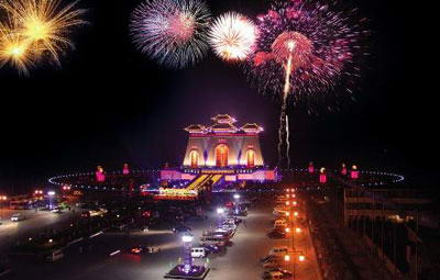 为了增强观赏性,中国华门共建有十大景观:源远流长、门开国盛、尧天舜日、东方巨龙、连环九鼎、天下巨联、登高望远、华门飞愿、名门博览、华门之夜,每一景都蕴含着丰富的文化内容。比如,主门正前方长达25米的瀑布墙,代表着孕育中华民族的母亲河———黄河之水高悬而下,中华民族由此渊源;中间自上而下依次排列的21个彩球,代表着尧舜之后中国的21个历史朝代;进入中国华门所经过的56级黄褐色台阶,则代表着56个民族。 |