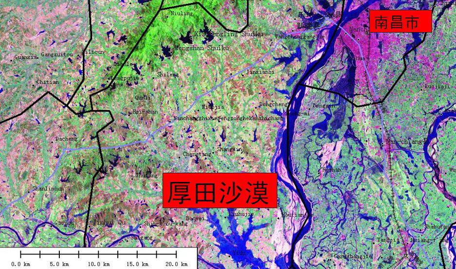 逼近南昌城的沙漠,涉及新建县厚田乡、南昌县岗上镇及富山乡。由于地壳变迁、河流改道,在这些地方形成了带状分布的风沙化土地,面积多达11.7万亩。其中新建县有6.6万余亩,南昌县5.1万多亩,成为“江南第一沙漠”。