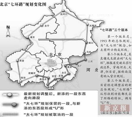 该专家介绍,1993年版规划的“七环路”起自琉璃河,经庞各庄、榆垡、安定、采育、永乐、t县等重点镇,然后借道河北境内的大厂、三河等地,进入平谷的马坊、峪口,此后继续向北向西连接太师屯、汤河口、永宁、康庄、斋堂,最后向南经张坊回到琉璃河,完成一个环形。各个方位的道路等级可能也差别很大,“南部和东部的标准高一些,可建成高速公路或一级公路,而西部、北部很多山区路段就直接利用国道和国道的放射线”。