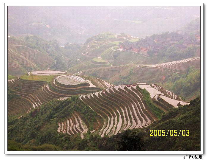 5.3 早晨起来逛逛,天阴,吃了米粉早餐(这里不错),谈了向导的钱(10元,背包再加10元,从田头出发,3号景点,再走小路到1号景点,对于旅游团常规的2号点我们舍弃了),9点左右出发,田头到3号点的路好走,基本石板路,中途不时避雨,越往上走,越开阔,梯田的气势也渐渐显现出来,在阴雨天,远处是迷茫的雾,影影绰绰看见些山寨,近处的梯田边散着些小花,边上陪衬的是一丛丛油绿的叶子,很鲜亮,没有全灌水的梯田长着青草,不时有身着红瑶服饰背着背篓的向导和一些散客,与我们擦肩而过,或是同驻路边的草棚避雨歇息。到了3号景点,是一个开阔地,一阵山风带来草木清新的气息,在优美的曲线勾勒下,水的亮,土的褐,草叶的绿,再点缀片片花海,真一幅美景。从3号景点到1号景点的小路不太好走,有些是泥路,雨天路滑,岔路多。在筋疲力尽的跋涉几个小时后,终于在中午12点多赶到了1号景点我们订的全景楼(40/床,平时30,每层都有公用卫生和洗澡,很卫生的),美美的吃了一顿农家菜(黄闷鸡和竹筒鸡都不错),终于天也放晴了。从我们住的3楼看出去,美丽的梯田就在眼前,一个下午就在附近呆呆的看风景,灌了水的梯田真美,真壮观,随着光线的变幻而变化,晚上在露台上摆桌酒菜,就着烛光,只可惜今夜厚云无星。半夜被闪电和雷鸣惊醒,闪电划破夜空,线条美绝了。