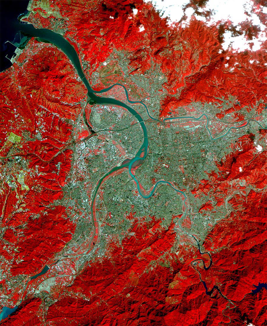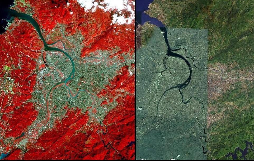 因为绿色植物反射红光能力很强,所以当用红光镜头时,就会出现左图的台北市,右图为对比普通图.上面文章出处为2004年9月<兵工科技>杂志.本人转摘.