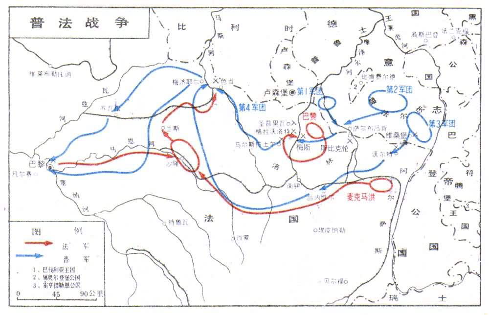 1870年 7月19日法国向普鲁士宣战。法皇拿破仑三世任法军总司令,E.勒布夫任参谋长,计划集中兵力迅速越过国界,向法兰克福突进,切断南北德意志的联系,迫使南德意志各邦保持中立,全力击败普鲁士。但实际上法军动员和集结缓慢,到7月底才集结于边境8个军约22万人,于8月初编为两个军团,分别由M.-E.-P.-M.de麦克-马洪元帅和A.-F.巴赞元帅率领;且后勤供应极差。普王威廉一世任普军总司令,H.K.B.von毛奇任参谋长,计划集中优势兵力,进攻阿尔萨斯和洛林,力图将法军主力歼灭于普法边境或将其赶到法国北方,继而进攻巴黎。普军动员计划周密,由铁路运输部队,至7月底,已于边境集结3个军团约47万人,且装备齐全。8月2日,法军在萨尔布吕肯地区首先向普军发动进攻,但并无有力的作战行动。普军旋于8月4日转入进攻,越过国境。法军在边境地区不利的阵地上迎击普军的进攻,在维桑堡会战(8月4日)、沃尔特会战(8月6日)和斯比克伦会战(8月6日)中一再失利。巴赞犹豫不决,时而决心退向沙隆与麦克-马洪会合,时而决心在梅斯防御。当最后决定向沙隆撤退时,已丧失时机,普军已逼近。经8月14日的马尔斯拉土尔会战和8月18日的格拉沃洛特-圣普里瓦会战,巴赞军团被普军第1、第2军团合围于梅斯。麦克-马洪率军退往沙隆。他原准备诱敌深入,在巴黎城下与普军决战。帝国政府担心继续退却会在国内引起动荡或革命,令其前往解救巴赞,于是麦克-马洪于8月22日率军从兰斯出发前往梅斯。此时,从柏林传来一则假消息,说除围攻梅斯的部队外,普军决心全部向巴黎挺进。实际上普军第3军团仍在继续追击麦克-马洪军团,并向右实施大胆迂回,协同新编成的第4军团将麦克-马洪率领的法军连同拿破仑三世一起围困于色当。