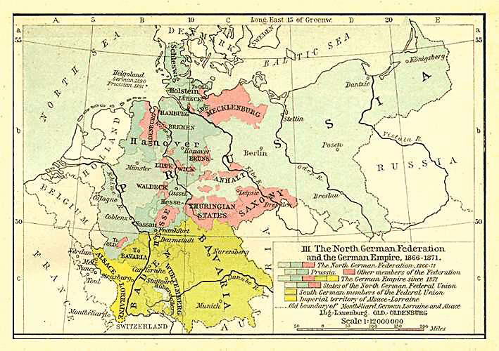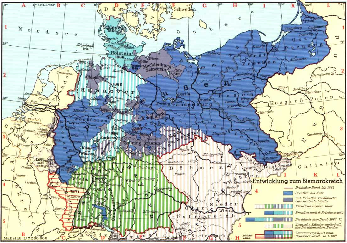 1864年,普鲁士和奥地利发动对丹麦的战争,丹麦惨败,根据《加斯泰因条约》,丹麦放弃对石勒苏益格-荷尔斯泰因的权利,由普奥共管。1866年,普鲁士为夺取德意志联邦的领导权,经过精心策划,以普奥有权共同占有石勒苏益格-荷尔斯泰因两公国为借口,蓄意向奥地利挑战,于6月7日将军队开进由奥地利管辖的荷尔斯泰因。奥地利亦声言将进军石勒苏益格,并在德意志联邦议会中提议由同盟进行反普鲁士的战争。 6月14日联邦议会表决后,战争开始。普鲁士利用同意大利的结盟,将部分奥军吸引到南部战场。在南部意军失利的同时,北部的普鲁士军队在短时间内控制了整个北德意志。7月3日,29.1万普军与23.8万奥军在萨多瓦展开决战,普军击败奥军主力并进逼维也纳。7月3日,普军在柯尼希格雷茨战役中再败奥军。法国应奥地利之请出面调解,7月26日缔结停战协定。8月23日签订《布拉格和约》,普鲁士获得石勒苏益格-荷尔斯泰因及汉诺威等地。奥地利退出德意志联邦。次年以普鲁士为首建立北德意志联邦, 为O.von俾斯麦首相以铁血手段最后完成德意志统一作了准备。普法战争后,最终实现普鲁士领导下的德意志统一。