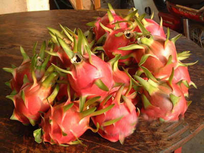 火龙果:超爱吃的,有红的和白的两种,但皮都是红的,里面就不一样了。很甜,非常好吃,用刀划开一个小口就可以掰开,看到那圆圆的果肉就觉得生活真幸福啊,呵呵。常常跟他两个人分一个吃,因为挺大一个的,里边还有像芝麻一样的籽。