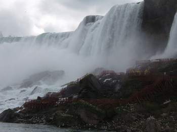 等船进入大瀑布, 每个人都穿上了蓝色的雨衣, 一群蓝雨人. 不过多亏了这件小小的雨衣, 让我们免于淋成落汤鸡.