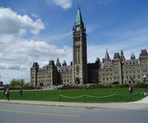 俯瞰渥太华河的一系列铜顶石砌哥德式建筑物,便是国会大厦(Parliament Hill),前面著名的钟楼上飘扬着加拿大国旗。庄严的国庆阅兵式就在蕴含着古老欧洲风格的国会大厦前举行。夏日的清晨,凉风习习,在国会大厦前可以观看到皇家禁卫军的换岗操练仪式。夜晚,国会大厦前的广场上,彻夜不灭的篝火伴随着优美的音乐,给参观者及乘凉者以极大的享受。