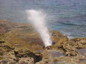 历经百万年海浪冲击而形成一整排的大小洞穴,有时潮水会从洞穴中喷出,就像大海在“打喷嚏”,因此而命名为喷水海岸。风浪大时潮水喷起的高度可达20英呎,相当壮观,这时如果你的千里眼恰巧看到了远处海水里,几头海龟爷爷正带着小的们在早炼。