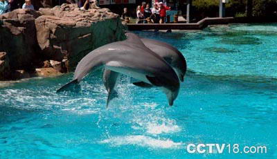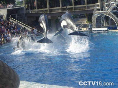 这个冠以"杀人"鲸的动物显得既憨厚而促狭,它们用鳍轻拍水面,观众席上前四五排的观众立即享受到了清凉的海水浴;而它一次腾空翻转,那个七百万加仑的池子便立即惊涛骇浪,四溢的咸水不但浇透前几排的观众,后14排内几乎都很难幸免。除杀人鲸秀外,海豚、企鹅、海狮等海洋动物亦有不可思议的精彩表演。