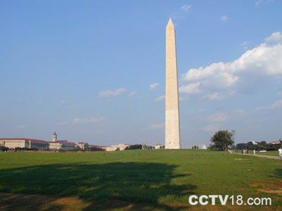 华盛顿纪念碑是为纪念美国首任总统乔治·华盛顿而建造的,从1848年动工直到1884年才完工。它位于华盛顿市中心,在国会大厦、林肯纪念堂的轴线上,是一座大理石方尖碑,高169米,其内墙镶嵌着188块由私人、团体及全球各地捐赠的纪念石,其中一块刻有中文的是清政府赠送的。它的四周是碧草如茵的大草坪,这里经常会举行集会和游行。