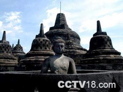 “婆罗浮屠”,就是建在丘陵上的寺庙的意思。它大约建于公元778年,长宽各123米,高42米,动用了几十万名石材切割工、搬运工以及木匠,费时五十至七十年才建成,是世界上最大的佛教遗址。随着15世纪当地居民改信伊斯兰教,婆罗浮屠旺盛的香火日渐衰竭。后因火山爆发而遭堙没。直到十九世纪初,人们才从茂盛的热带丛林中把这座宏伟的佛塔清理出来。1973年,婆罗浮屠佛塔得到了联合国教科文组织的资助,开始了大规模的修复工程。