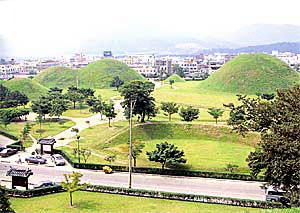 远眺庆州市区,最引人注目的是高耸的巨大古坟。如果骑自行车或步行至这些巨大的古坟,便可以感受到现代和古代共存的神奇。这个大陵园面积12万坪,是新罗(BC57-AD935)的王和贵族的坟墓群。