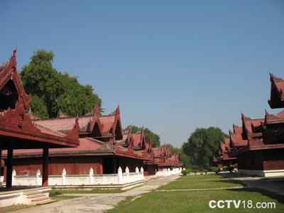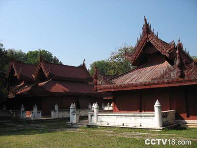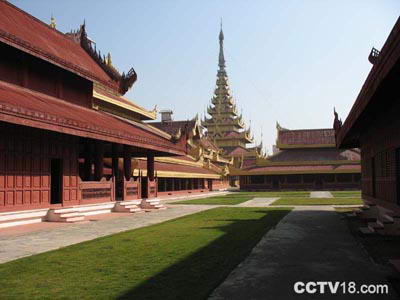 王宫远没有北京的故宫大,但里面的建筑也很多,有皇帝上朝召见群臣的大殿、居室、嫔妃居住的一大片后宫,金瓦红墙,都是缅式风格,可惜都没有家具陈设。内有古代缅甸文化博物馆,展出当年宫廷的服装、用品和佛教艺术。