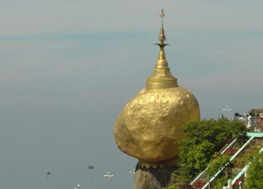 风动石是悬崖边上的一块巨石,与地面接触面积很小,风吹过时甚至随风摇动,却不会坠落,故而被缅甸人奉为神石,并将其贴成金色,前往朝拜的缅甸人和佛教徒常年络绎不绝。据民间传说,一年内去朝拜三次就会带来财运。