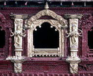 庙为四合院式的三层庙宇。参观者只能到庙中庭院,不得近前。大门上有一排精美窗棂和檐柱,刻有难近母杀死牛魔等神往故事。童女神殿是雕花木楼,一、二层窗户不能开启。顶层居中有一扇垂红色布幔的金窗,内室设童女神的黄金宝座,其精致可与国王镏金雄狮宝座媲美。底层为孔雀、鹦鹉、大象以及表现狩猎、歌舞、性爱的各种塑像。正对庙门的南殿内供有3尊释迦牟尼佛像。活的童女神长年居住楼中,有教师教导,亦可选玩伴进庙陪伴,但她绝不能离庙。她每日在规定时间在三楼窗口露面,受人瞻仰求卜。善男信女以其喜、怒、哀、乐的表情,卜测吉、凶、哀、乐。月经来潮则还俗。