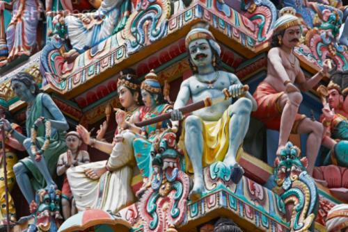 马里安曼兴都庙(Sri Mariamman Temple),也叫印度庙,是牛车水的心脏地带,也是新加坡最古老的印度教寺庙,建于1827年,原是木造建筑,现在以砖石为主,是1843年重建的。外观相当华丽,大门上的塔楼是标准的南印度达罗毗荼式庙宇,上面立有许多色彩缤纷的立体神像,其中最醒目的是这座庙里供奉的马里安曼女神。