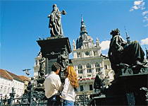 老城区中心广场(Hauptplatz)是老城区最热闹的地方,也是徒步游览的最佳起点。广场中心的市政厅(Town hall)华丽雄伟,是格拉茨的标志建筑;中央是约翰大公爵喷泉(Erzherzog-Johann-Brunnen),喷泉中央的雕像纪念格拉茨最受爱戴的君王——约翰大公爵,雕像旁有四位美女塑像围绕,象征着流经施泰尔斯塔特的4条河流:茵斯河(Enns)、穆尔河(Mur)、德拉瓦河(Drau)、桑恩河(Sann),喷泉的阶梯也是游客最好的休憩点;广场旁的大街就是繁忙的海仁街。