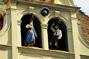 音乐钟楼广场于海仁街后巷的音乐钟楼广场(Carillon/Glockenspielplatz)上,有一栋墙面绘有金黄色壁画的钟楼,它建于1903年,每天11:00和下午15:00、18:00,屋顶上的音乐钟楼会播放音乐,接着窗户就自动打开,出现一对身穿传统服饰的木偶随着音乐翩翩起舞,最后,一只金鸡探出头来鸣叫三声方告结束,十分可爱有趣。这处广场也是咖啡馆、酒吧、餐厅的聚集处,非常热闹。