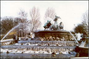 吉菲昂喷泉位于哥本哈根市中心东北部。它由吉菲昂女神和四条牛及套犁等一组铜塑组成。吉菲昂是北欧神话中的一位女神,相传古代瑞典有个叫戈尔弗(Gylfe)的国王,答应吉菲昂女神可以从瑞典国土上挖出一块土地,但限时一昼夜,挖多少算多少。于是吉菲昂女神就把她的四个儿子化为四条牛,用犁从瑞典国土上挖了一大块土地,并把它移到海上,从此,瑞典的国土上留下了一个维纳恩湖(Vanern),而挖出来的土地就是现在哥本哈根所在的西兰岛(Sjælland)。从地图上看,西兰岛的海岸线和维纳恩湖的形状确实十分相似。这就是传说中西兰岛的来历。神话中的吉菲昂女神一生未婚,但她却同大力神生下了四个儿子。
