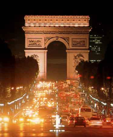 凯旋门地处宽阔的星星戴高乐广场。这里是乡赛丽寨大街的尽头,又是沙佑山丘的最高点。从戴高乐广场向四面八方延伸,有12条大道。宏伟、壮丽的凯旋门就耸立在广场中央的环岛上面。这座拱门是在拿破仑时期1806年由夏尔格兰负责动工建筑的。