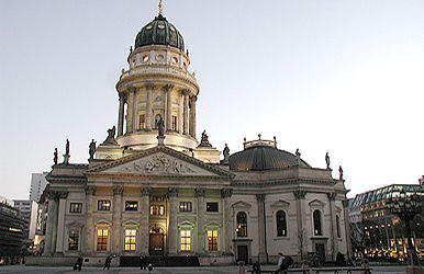 德意志大教堂坐落在宪兵广场南侧,与对面的法兰西大教堂形成一对姊妹建筑。设计了拉长的教堂拱顶的建筑师卡尔·冯·龚塔德被腓特烈大帝称作“一头驴”——这当然是在1781年之前,那时教堂圆顶尚未塌毁。