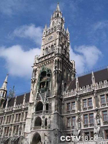 整个建筑布局恢宏、装饰华丽,从1867年起用了40年时间才建成。市政厅85米高的钟楼上有全德国最大的木偶报时钟(Glockenspiel),每天11、12、17点以及晚上21点的整点时,就会有真人大小的32个木偶演出历史剧,内容是1558年威廉5世的婚礼情景。此时塔阁里许多彩色人像开始动作,或手持斧剑,或骑着骏马,或提着花灯,或吹着洋号,分上下两层,排着队簇拥而出,配合音乐节奏,举手投足,载歌载舞,惟妙惟肖地再现了当年大婚庆典的场景,持续10分钟。每天上午吸引不少游人观看,特别是初到慕尼黑的人,都不愿错过。