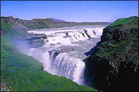 黄金瀑布在盖锡尔喷泉北面十公里处,是冰岛人最喜爱的瀑布,也是欧洲著名的瀑布之一,倾泻而下的瀑布溅出的水珠弥漫在天空,在阳光照射下形成道道彩虹,仿佛整个瀑布是用金子锻造成的,景象瑰丽无比,令游客留连忘返。