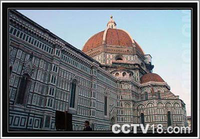 翡冷翠最著名的一组建筑——花之圣母大教堂(主教堂)、洗礼堂和钟塔被紧紧包围在Duomo广场中心,人们要一直走进广场,抬起头来,才能看清主教堂的立面。广场和周围的街道,密密排着各色店铺,人来人往,非常繁华。这组建筑群不象比萨的那样仿佛是专门供人欣赏的陈列品,而是兴高采烈地挤在市民日常生活的漩涡之中。1296年开始建造这主教堂的时候,市民们正陶醉于从贵族手中夺回政权的胜利中,为了庆祝胜利而建造这主教堂。这是一座由白色、粉红、绿色大理石按几何图案装饰起来的美丽大教堂,除了白、粉、绿三主色外,还有红色、黄色、褚色……再加上一排雕像。主教堂的性格热情而欢乐,凝结着翡冷翠市民热烈的情绪。