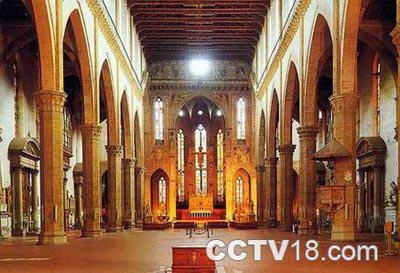 教堂里宽大的正偏三殿间以八棱列柱,列柱上飞起大跨度的双沿尖顶连拱。经过16世纪部分改建以后,这座教堂变得更加美丽。从入口到三大殿尽头,整个地板用旧墓石铺就,教堂的窗玻璃彩画都是14世纪末期作品。教堂的圆顶帕奇礼拜堂(Appella de’Pazzi)由布鲁内雷斯基所设计,装饰有阿鸟洛·加迪1380年画的壁画《圣十字架传说》,祭坛上有杰里尼作的多联画《圣母和圣徒》,上面有乔托工作室作的《殉难十字架》。