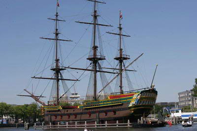 阿姆斯特丹人在政府的资助下,花了数年时间仿造了这艘“阿姆斯特丹”号:它是16世纪末用于与远东进行贸易的大型帆船之一,这些船被称为“东印度舵手”。这些大船飘洋过海,从印度、锡兰、中国、暹罗、日本和印度尼西亚运回大量商品,在阿姆斯特丹港口每年要举行四次拍卖会。由于商船可能会遭受台风或海盗的侵袭,因此每艘船都重得像战舰一样,并且是根据一定的“合同”修造的。