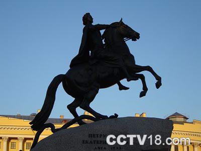 青铜骑士是圣彼得堡市标志性雕塑,位于十二月党人广场上。著名雕塑家法儿科内创作的这一艺术佳作,被安置在一块巨石上,骏马前腿腾空,彼得大帝安坐在坐骑上,两眼炯炯有神,目视前方。该马象征着俄罗斯,而马匹践踏着的蛇,代表着当时阻止彼得大帝改革维新的力量。从任何方向欣赏这座塑像,都可以强烈地感受到它的艺术魅力。这一塑像曾受到伟大的俄国诗人普希金的高度颂扬,写下了他最出名的叙事诗《青铜骑士》。