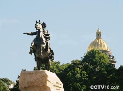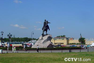 广场的北面耸立着一座青铜骑士像,这位头戴桂冠的骑士身披战袍,目视前方,他胯下的骏马前蹄离地,腾身跃起,一声长嘶,欲腾飞而去。这个骑士就是圣彼得堡的奠基人彼得大帝的纪念像。铜像下面的基座似被海浪冲击的礁石一般,整个底座用一整块1600吨重的大理石雕凿而成的,十分壮观,堪称巨石之作。