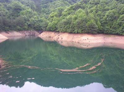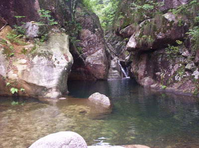 再往上行至山顶,豁然开朗,两山之间砌着一道长石坝,拦住清泉,形成一湾水库,高山出平湖,湖水清澈碧绿,似一块巨大的翡翠,山风阵阵,波光粼粼,疑为瑶琳仙境。四面群山如聚,树木葱茏,青松古柏,生意盎然,无论从那个方向看过去,均如巨幅山水画卷,景色秀美绝伦。九龙池所处的峡谷,怪石峥嵘,峭壁看似惊险,却有路可攀,密林中兰草丛生,苔藓铺地,琼花玉叶随处可见,实为一个观景探险、健身休闲的好去处。