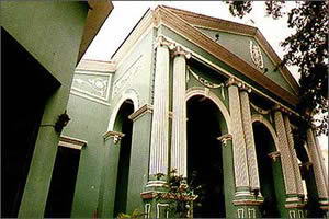 建筑整体粉刷以绿色,衬托墨绿色门窗及红色屋顶在以黄色为主调的周围环境既和谐共处又突显个性。