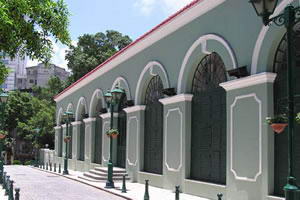 岗顶剧院葡文原称伯多禄五世剧院(TheatroDomPedroV),华人又称马蛟戏院或岗顶波楼。该剧院1860年由澳门葡人集资兴建,以纪念葡萄牙国王伯多禄五世,但当时只建成主体部份,至1873年加建具柱廊、拱廊及新古典主义三角楣的入口立面。其后曾多次维修,并曾因白蚁蛀蚀关闭了将近20年,至1993年进行内部维修后重开。2001年内部又再重修。整幢剧院的主体建筑基本保存完整。