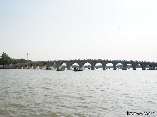 万寿山以南,是碧波荡漾的昆明湖,西部是仿杭州苏堤而建的西堤,将湖面分为东西两半,西堤有六座桥梁,以玉带桥最为有名,远远望去,如玉带轻飘。据说,乾隆皇帝,慈禧太后都爱游西堤。慈禧曾在这里化装成渔婆,命太监李莲英扮成渔公,二人合影留念。与西堤相接的东堤是一道石造长堤,中段有仿卢沟桥而建的十七孔桥,望柱上有神态各异的石狮564只。昆明湖烟波浩渺,气象万千。三座大岛,十七孔桥等与万寿山遥相呼应。