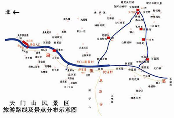 “天门洞”为华北地区目前发现最大的东西通透垂直穿山岩洞。太阳和月亮的光芒从洞中穿出,形成巍巍壮观的“日出天门”、“天门悬月”两种天文景观。这里还生长着我国北京地区较大的一片枫杨林,其间蜿蜒流淌着有天门泉水会聚而成的“扁担溪”,枫林幽幽、溪水潺潺,流水四季不断。