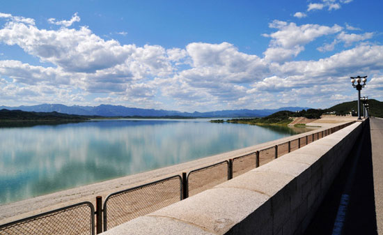 密云水库在密云县城北13公里处,它位于燕山群峰之中,横跨潮、白两河。水库是亚洲最大的人工湖,有“燕山明珠”之称。水库占地33.6万亩,库容43.8亿立方米,库水最深达60多米。它是北京市民用、工业用水的主要来源。库区夏季平均气温低于市区3℃,是一处避暑胜地。