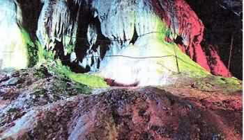 由于山体碳酸钙结晶胶结,整座山体中形成了诸多形状怪异的岩溶洞,而且洞中有洞,洞洞相连;洞洞有潭,流水潺潺。有一处溶洞,洞长几十米,宛转幽深,进入洞中脚下溪水流淌,遍布于洞内的奇观异景———笑佛端坐、神猴攀飞、群猴欢聚、壁虎伏岩、乳石垂悬、石花争艳等幽洞妙景,形态万千,奇美异常。