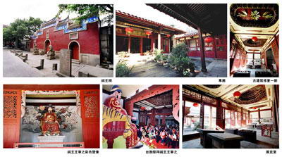 闽王祠南向,中轴线上依次排列为门墙、前庭、祀门、后庭和正殿,两侧夹墙,组成了一个具有福州地方特色的院落。