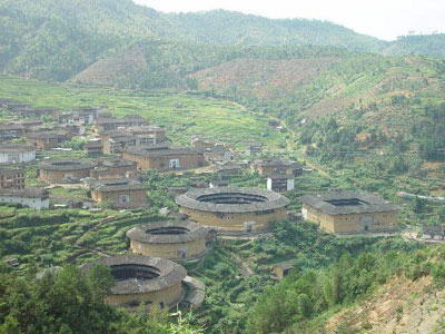 初溪土楼群位于永定县下洋镇初溪村,由五座圆楼和数十座方楼组成。