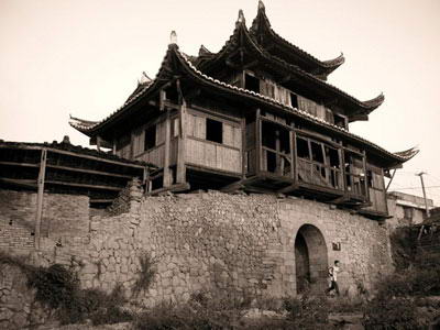 东门谯楼为三檐歇山式顶木质结构。其城墙墙体不像官府修建城池那样用特别烧制的城墙砖砌筑,而是全部用河卵石筑成。